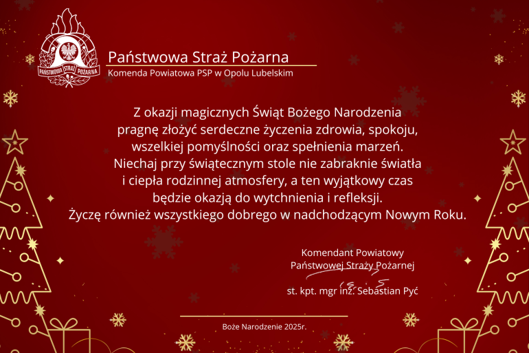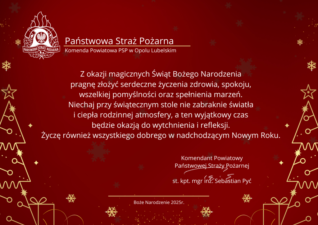 Aktualności, Ważny news Życzenia Bożonarodzeniowe Komendanta Powiatowego PSP w Opolu Lubelskim 23 grudnia 2025 Views: 67